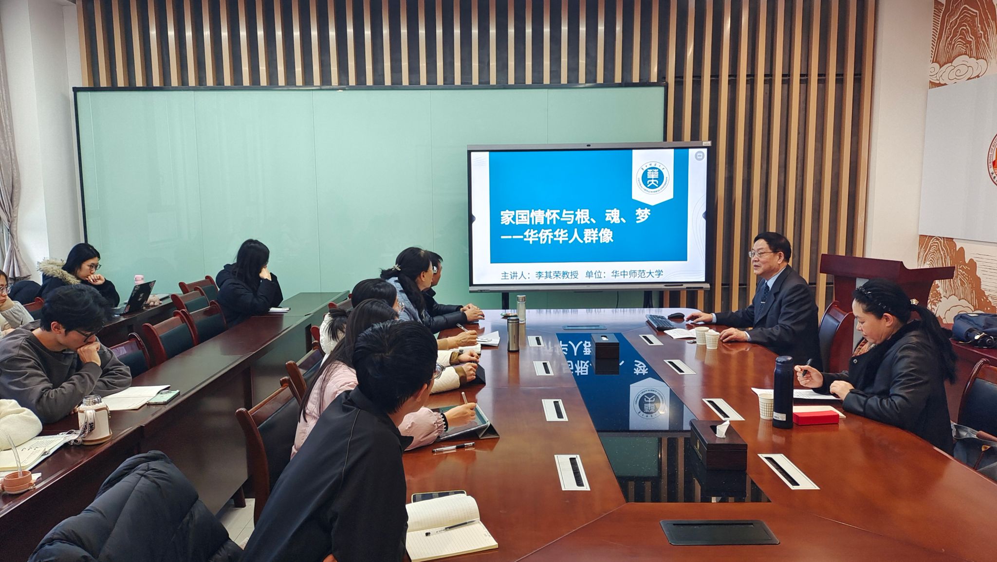 11月25日下午,华中师范大学国际移民与海外华人研究中心李其荣教授在我校历史文化学院三楼会议室,举办了题为《家国情怀与根、魂、梦——华侨华人群像》的学术讲座。本次讲座由历史文化学院秦艳峰副教授主持,学院部分教师与在校研究生到场聆听。