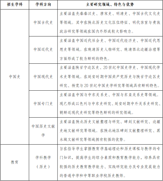 学院现有中国史一级学科硕士学位授权点,下设中国古代史、中国近代史、中国现代史、中国专门史、中国历史文献学5个研究方向。此外还设有学科教学(历史)二级学科专业学位授权点。现有硕士研究生导师29人,其中本院导师26人、外院导师2人、校外兼职导师1人,在校硕士研究生人数124人。学院设有陕北历史文化研究中心(陕西省哲学社会科学重点研究基地)、陕西省人民政协理论与实践研究基地、陕西地区韩国独立运动研究与韩国学教育研究基地等研究平台3个,地方历史文献与文物数字化实验室1个,微格教学实验室1个,资料室1间(中、外文期刊80多种,藏书共计10万余册)。